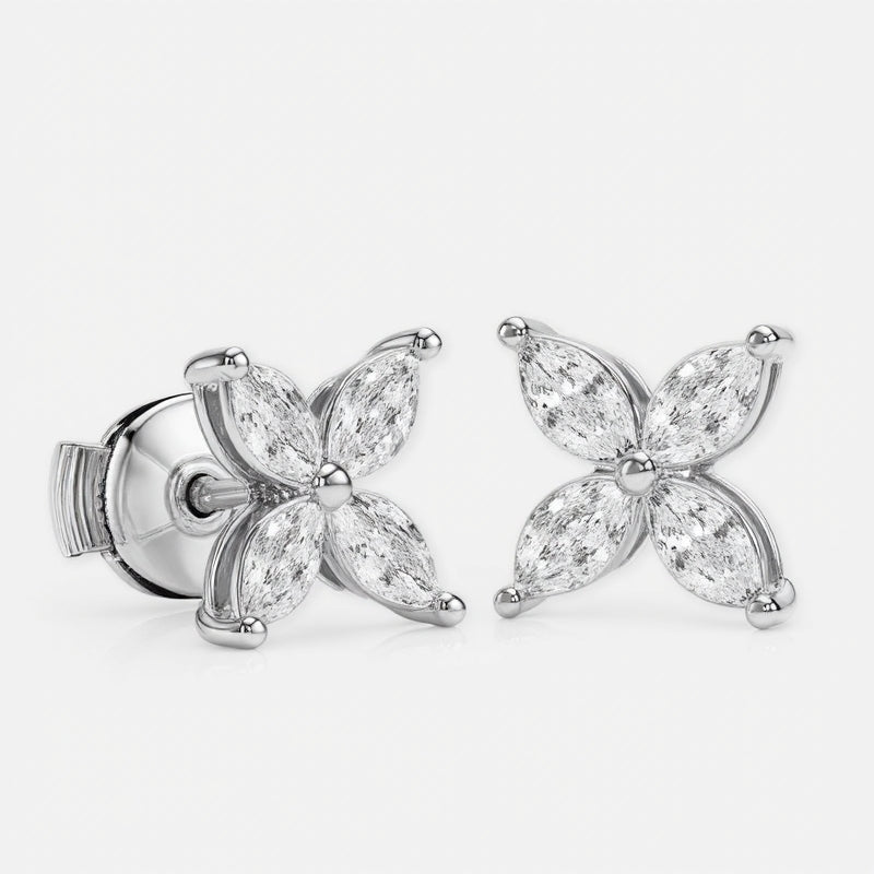 A pair of stud earrings in white gold features eight marquise-cut diamonds\u2014four per earring\u2014arranged symmetrically as a four-petal flower around a polished round center. Each diamond petal is secured by discreet prongs that emphasize the delicate floral motif. They sit side by side against a seamless white background under bright, even studio lighting that accentuates the metal\u2019s sheen and the stones\u2019 brilliance in a clean, high-key photographic style.