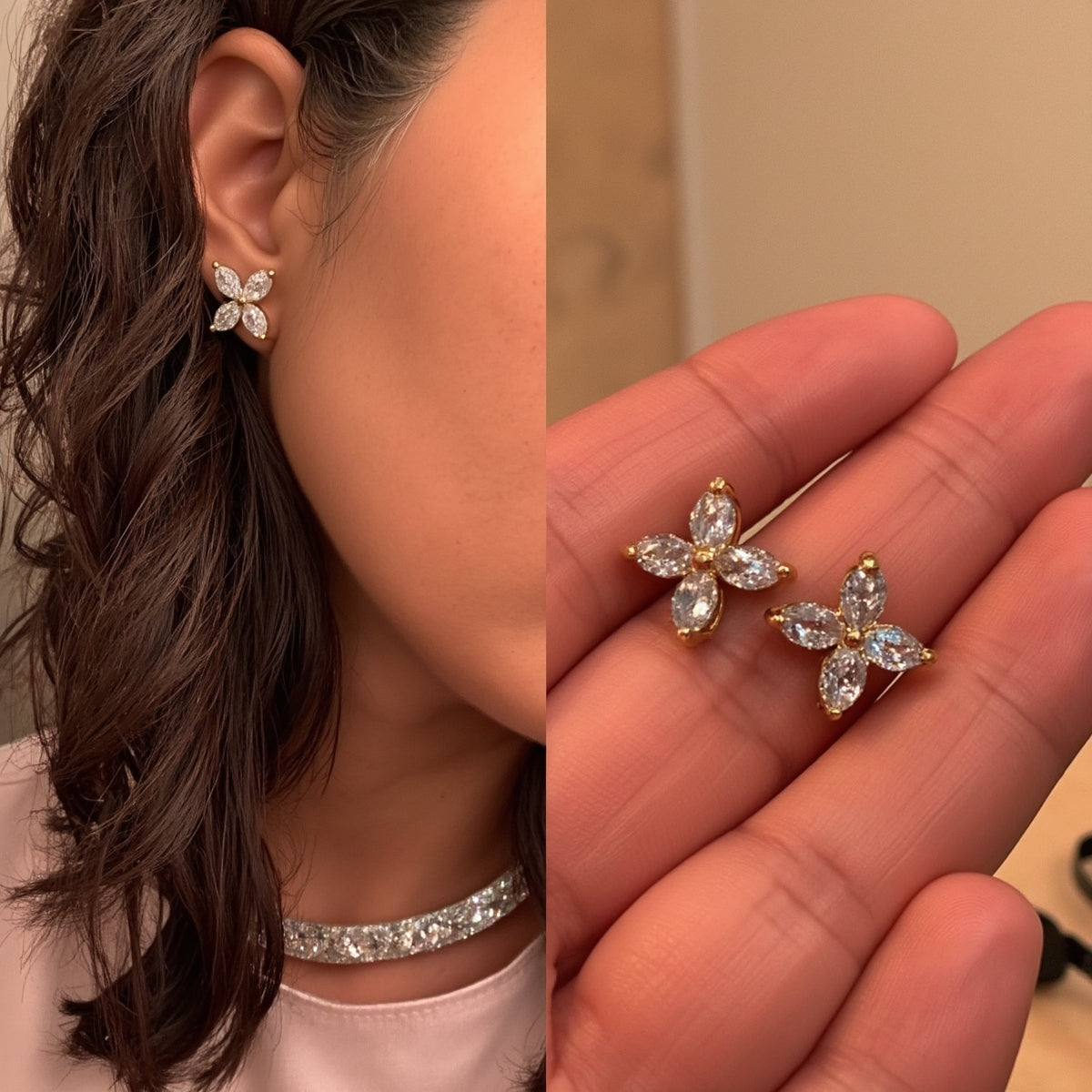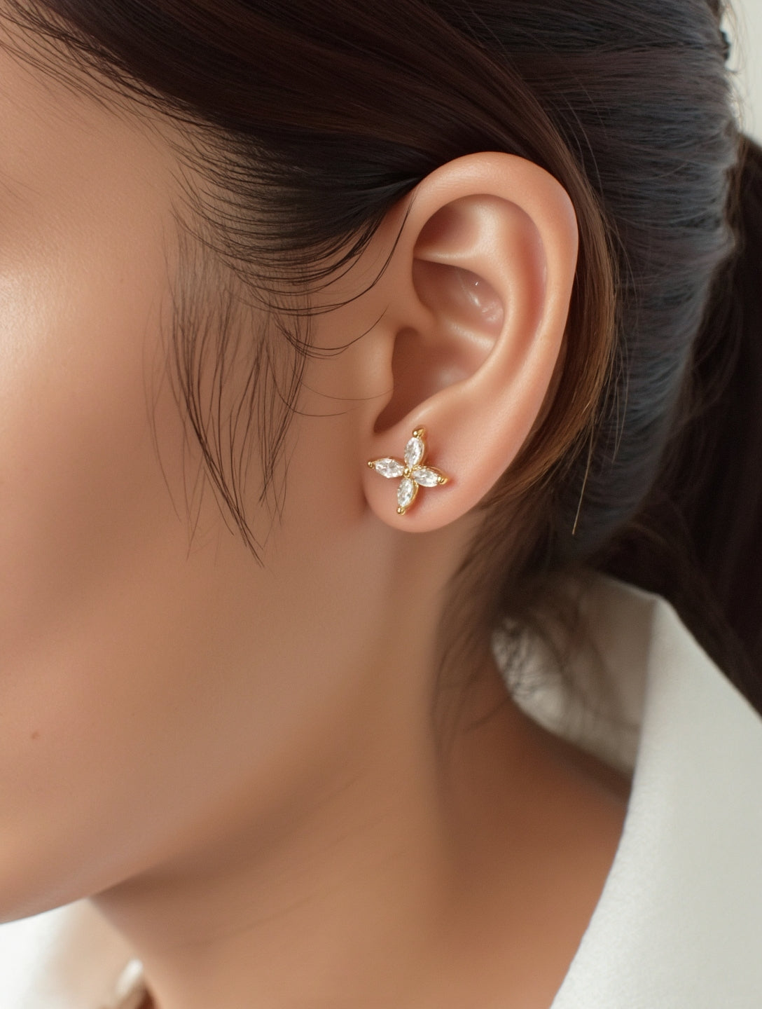 A single gold stud earring with four marquise-cut clear stones arranged in a cross-like floral pattern is shown snugly on the wearer\u2019s earlobe. Each stone is held in a delicate prong setting of warm yellow metal that gleams softly under diffused, natural lighting. The close-up shot captures fine details against a neutral backdrop of skin tones and dark hair, giving the image a minimalist, editorial feel.| Adorn By You